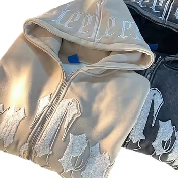 Sudadera con capucha lavada con ácido de peso pesado personalizada, algodón de alta calidad, logotipo con cremallera, hombro caído, parche bordado desgastado 3D bordado